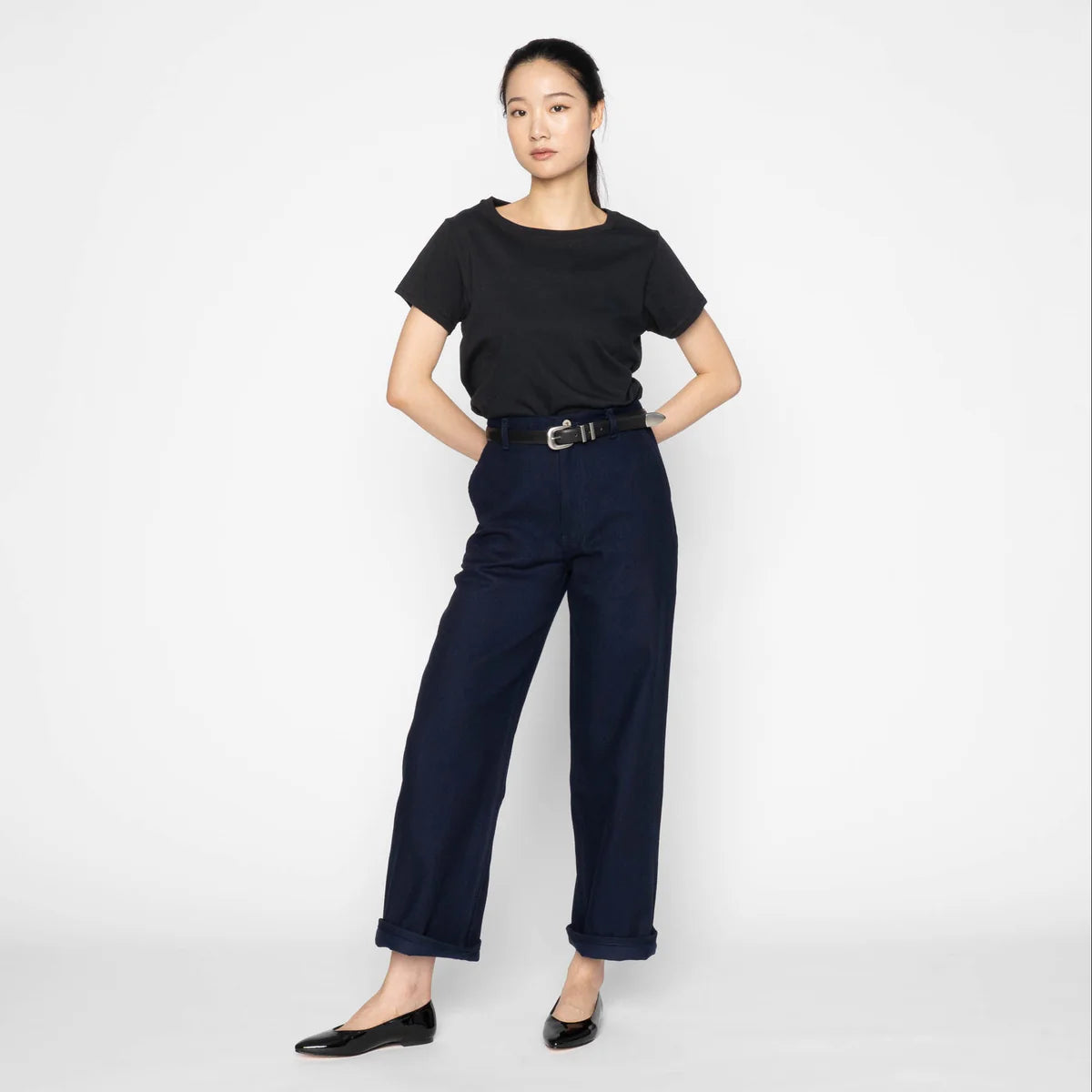 The Maudie pant is a mid-rise, wide-leg cropped pant with slash pockets and back patch pockets.